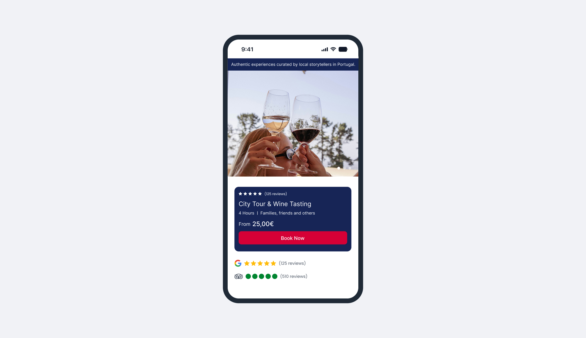 Não uma homepage genérica com uma descrição da empresa. Páginas específicas por produto, com título claro, descrição detalhada, fotos reais, preço visível, duração, ponto de encontro, política de cancelamento e botão de reserva integrado com o sistema.