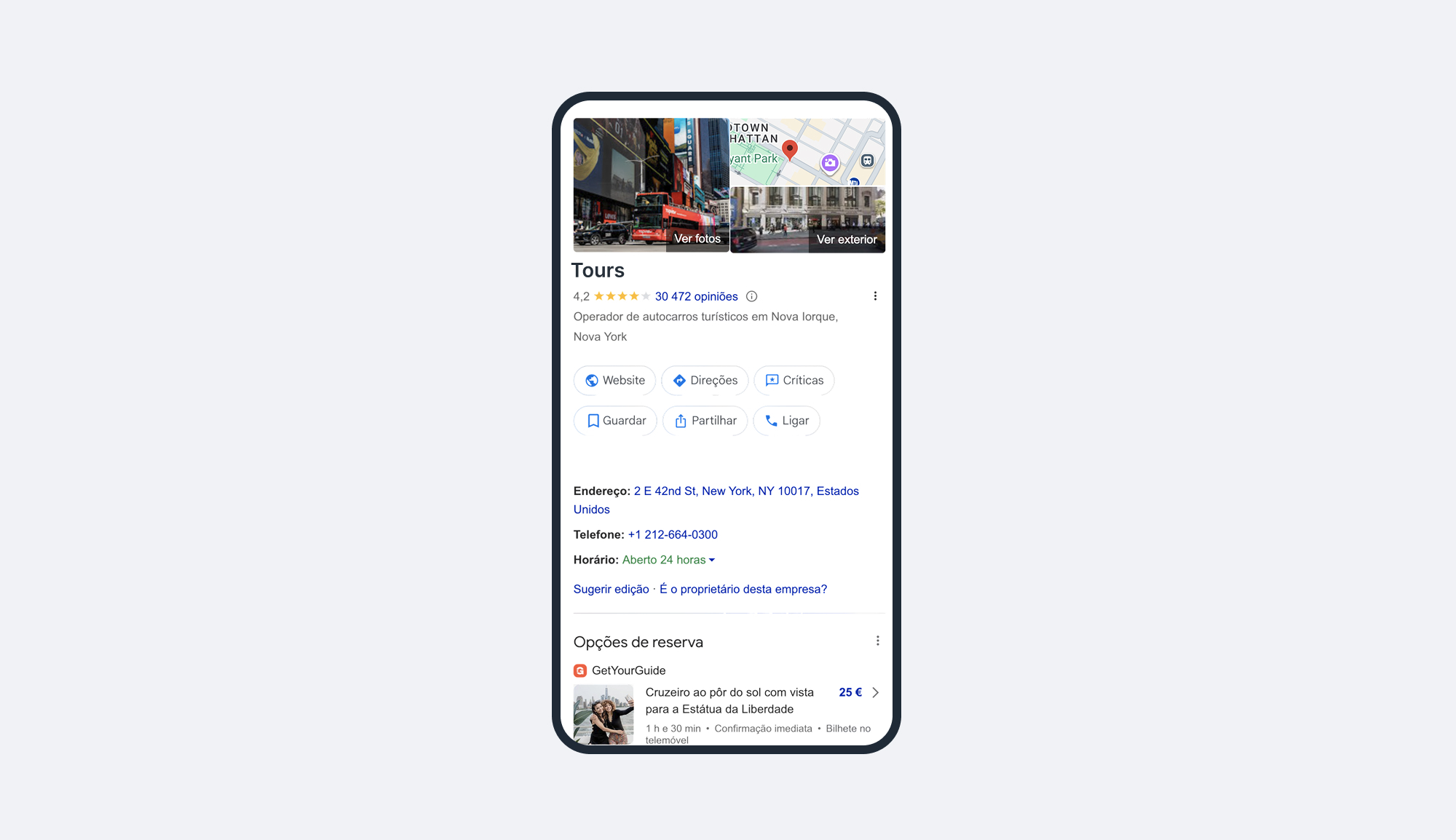 Quando alguém pesquisa "tours em Lisboa" ou "passeios no Douro", o Google apresenta uma lista de negócios antes de qualquer resultado orgânico ou anúncio pago. É aqui que muitos operadores simplesmente não aparecem, ou aparecem com um perfil incompleto que não inspira confiança.